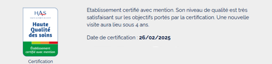 La Haute Autorité de Santé (HAS) a attribué à l’Hôpital Fondation Adolphe de Rothschild la mention « Haute qualité des soins », soit la plus haute distinction possible pour un établissement de santé. Une reconnaissance exceptionnelle qui témoigne de l’engagement collectif des équipes pour offrir des soins de la plus haute qualité à nos patients.